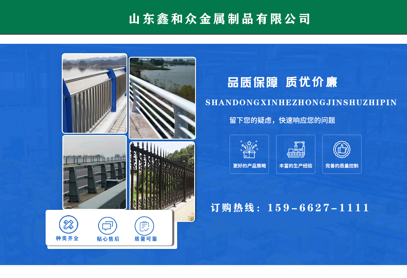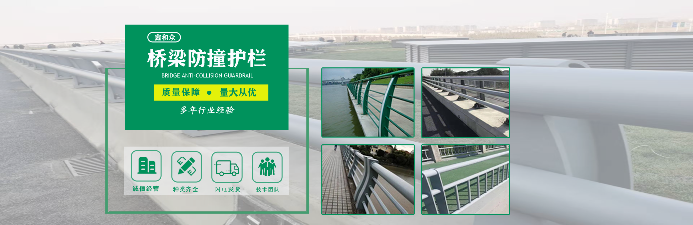 山東鑫和眾金屬制品有限公司主要產(chǎn)品有防撞護欄,橋梁護欄,道路護欄,河道護欄,不銹鋼護欄等護欄。提供設計方案,一站式定制,包您滿意價格優(yōu)惠,歡迎來電咨詢!    公司常年從事銷售護欄防撞護欄,橋梁護欄,道路護欄,河道護欄,不銹鋼護欄,橋梁鋼護欄,河道燈光護欄等。產(chǎn)品廣泛應用于橋梁、河道、旅游景區(qū)、道路、公路、公園、小區(qū)、景觀、道路防撞等領域。    公司產(chǎn)品均采用優(yōu)質不銹鋼材料,符合相關標準。各種型號不銹鋼復合管及護欄,質量嚴格把控。產(chǎn)品強度高、耐腐蝕、焊接牢固、抗沖擊、性能好,防撞護欄結構簡單、美觀實用大方。     歡迎前來訂購!...